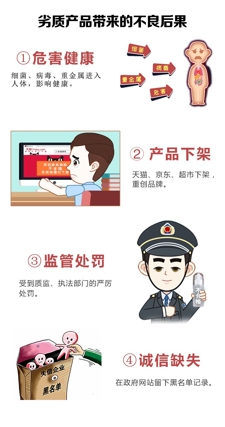 嚴謹出精品!嚴格按照GMP生產(chǎn)規(guī)范!生產(chǎn)前原材料檢測,確保原料合格。生產(chǎn)中半成品檢測,確保生產(chǎn)過程無污染。生產(chǎn)后產(chǎn)品檢測并且出具出廠檢測報告,確保產(chǎn)品符合標準,從原料到成品層層把關,確保每一件均為精品。不怕被質(zhì)監(jiān)部門、電商平臺抽檢!